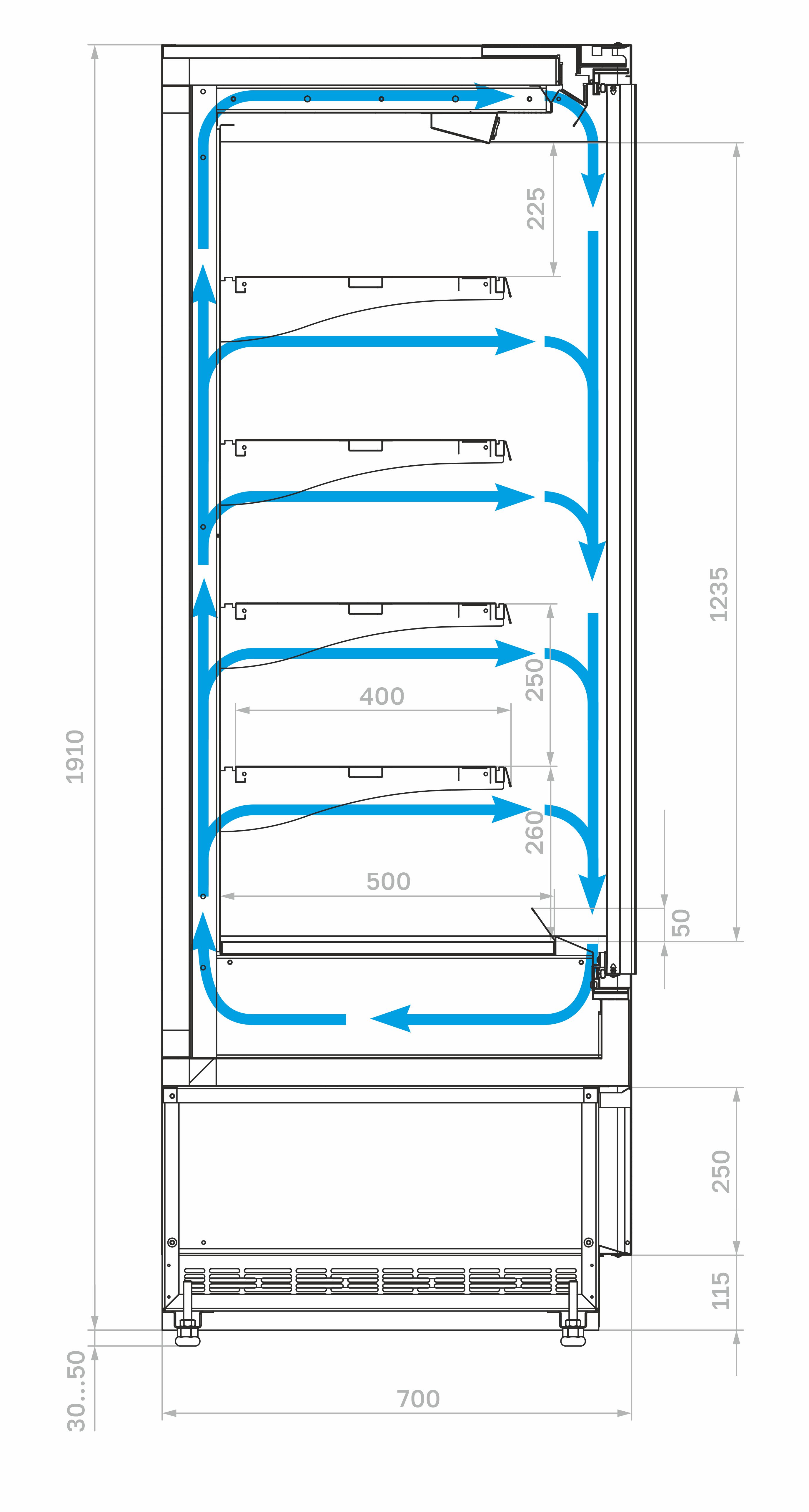 Модель оснащена 4 рядами навесных полок с кронштейнами, подставкой с фронтальной термовыводящей и цокольной решетками. Корпус прямоугольной формы изготовлен из стали с антикоррозийным покрытием: внешние панели, полки и кронштейны серого цвета (RAL 9006), цоколь и интерьер — черного цвета (RAL 9005). Теплоизоляция выполнена из пенополиуретана.