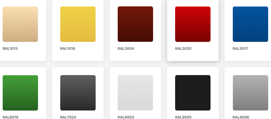 Модель представлена в 10 стандартных цветовых исполнениях фронтальной панели по таблице RAL: 9003, 9006, 9005, 3004, 7024, 1016, 6018, 3020, 5017, 1015.