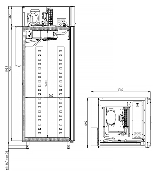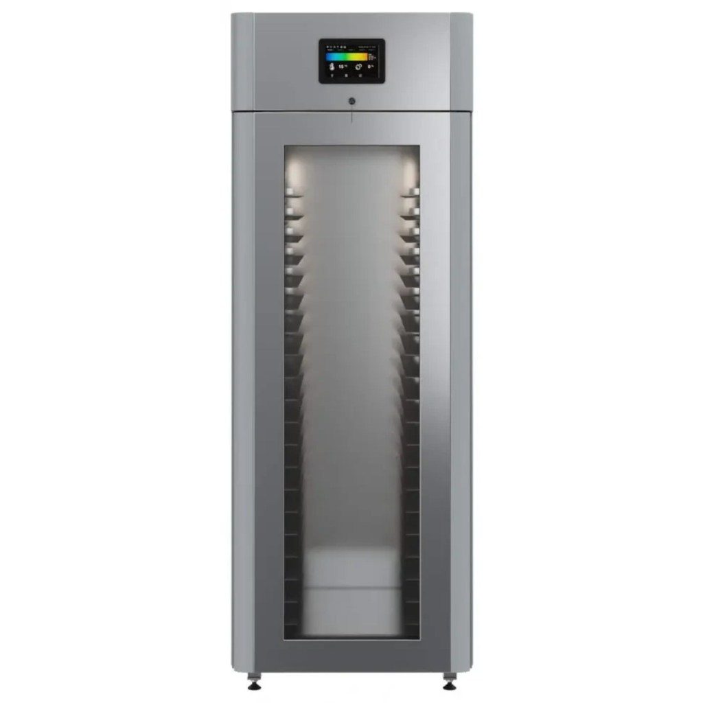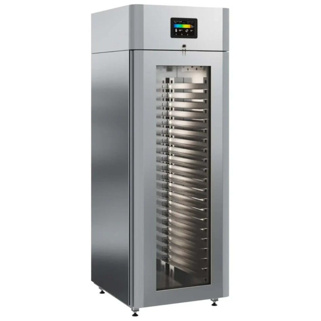 Каталог оборудования Холодильное оборудованиеШкафы холодильныеСпециализированные холодильные шкафыШкаф холодильный для хлебопекарных производств Polair CS107-Bakery Br со стеклом (Тип 2) Шкаф холодильный для хлебопекарных производств Polair CS107-Bakery Br со стеклом (Тип 2) Код товара: 062-623 Поделиться: WhatsAppTelegram СравнитьДобавить в КПВ избранное 0 419 900 ₽ В корзину 0 шт Под заказСамовывоз сегодня бесплатно Взять в кредит Купить в лизинг Получить консультацию в WhatsApp Описание Характеристики Отзывы 0 Инструкции 5 Шкаф холодильный для хлебопекарных производств Polair CS107-Bakery Br со стеклом (Тип 2) предназначен для создания оптимальных условий хранения и расстойки заготовок из теста на предприятиях общественного питания и торговли. Корпус цельнозаливной, выполнен из нержавеющей стали, дверь — стеклопакет. Оборудование стабильно работает при температуре окружающей среды до +40 °C. В комплект входят 20 пар направляющих размером 400×600 мм. Особенности: Многофункциональные режимы: охлаждение тестовых заготовок, замедление ферментации, хранение, регенерация, брожение и расстойка Динамическое охлаждение с мягким обдувом без заветривания и автоматическая оттайка с системой испарения конденсата Панель управления с 7" дисплеем: контроль температуры, влажности (регулируется от 60 до 95 %), скорости вентилятора и времени, возможность создания и сохранения собственных программ Встроенный ультразвуковой увлажнитель (требуется подключение к системе водоочистки и канализации) Эргономичная конструкция: верхнее расположение агрегата, распашная дверь со стеклопакетом и механизмом самозакрывания, педаль для удобного открытия, съёмные направляющие и легко заменяемый уплотнитель с магнитной вставкой Простота ухода: штампованное углубление в дне корпуса для сбора загрязнений Экологичный хладагент R290 Энергоэффективность: потребляемая мощность — 0,55 кВт (охлаждение), 0,9 кВт (нагрев) Толщина стенки корпуса — 43 мм Polair CS107-Bakery Br со стеклом (Тип 2) — современный шкаф отложенной расстойки, обеспечивающий полный контроль и гибкость при работе с тестовыми заготовками. Благодаря многофункциональным режимам, точной настройке параметров и продуманной конструкции, он становится надёжным решением для пекарен и кондитерских, стремящихся к высокому качеству продукции и удобству в эксплуатации.Изображение товара, представленного на фото, может отличаться от его фактического вида. Показать все Габаритные размеры697×1005×1960 ммДиапазон рабочей температурыот -10 до +40 °CДлина697 ммШирина1005 ммВысота1960 ммОбъём700 лКол-во дверей1 Тип двериСтеклянная Уровень влажностиот 60 до 95 %Направляющие под EN 40*6020 Расстояние между направляющими60 ммХолодильный агрегатВстроенный Тип оттайкиАвтоматическая Тип охлажденияДинамический ПодсветкаЕсть ХладагентR290 Вес нетто180 кгВес брутто205 кгБрендPolairВсе специализированные холодильные шкафы Из нержавейки Оставить отзыв Еще никто не оставил отзыв на этот товар Схема POLAIR CS107 Bakery Br.jpgИнструкция на POLAIR CS107 Bakery Br.pdfБрошюра на хлебопекарное оборудование POLAIR.pdfДекларация о соответствии.pdfСертификат соответствия.pdf Похожие товары Перейти в каталог Под заказ 402 050 ₽ Шкаф холодильный для вызревания мяса Polair CS107 Meat со стеклом (Тип 2) Под заказ 392 700 ₽ Шкаф холодильный для вызревания мяса Polair CS107 Meat черный, со стеклом (Тип 2) Под заказ 405 450 ₽ Шкаф холодильный для хлебопекарн