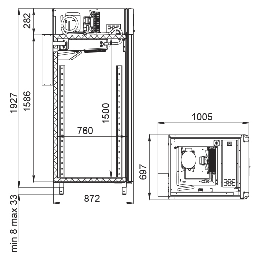 Каталог оборудования Холодильное оборудованиеШкафы холодильныеСпециализированные холодильные шкафыШкаф холодильный для вызревания салями Polair CS107 Salami со стеклом Шкаф холодильный для вызревания салями Polair CS107 Salami со стеклом Код товара: 062-631 Поделиться: WhatsAppTelegram СравнитьДобавить в КПВ избранное 0 385 050 ₽ В корзину 0 шт Под заказСамовывоз сегодня бесплатно Взять в кредит Купить в лизинг Получить консультацию в WhatsApp Описание Характеристики Отзывы 0 Инструкции 5 Шкаф холодильный для вызревания салями Polair CS107 Salami со стеклом предназначен для приготовления и хранения салями, сыровяленых колбас и других мясных деликатесов на предприятиях общественного питания и торговли. Корпус цельнозаливной конструкции выполнен из нержавеющей стали снаружи и внутри (кроме задней стенки), что обеспечивает высокую прочность и долговечность. Дверь выполнена в виде стеклопакета для удобного визуального контроля. Оборудование рассчитано на работу при температуре окружающей среды до +40 °С. Особенности: Динамическое охлаждение с мягким обдувом без заветривания Верхнее расположение агрегата Автоматическая оттайка с системой испарения конденсата Русифицированная многофункциональная панель управления с дисплеем 5" и возможностью создания и сохранения собственных программ Встроенный ультразвуковой увлажнитель (необходима подача очищенной воды и подключение к канализации) UV-лампа для обеззараживания воздуха внутри камеры 3 пары направляющих с тремя перекладинами и подвесами для колбас Регулируемый уровень влажности: от 60 до 95 % Распашная дверь с заливной теплоизоляцией, встроенной ручкой и магнитным уплотнителем Отключаемая внутренняя LED-подсветка Штампованное углубление в дне корпуса для удобства ухода Педаль для удобного открытия двери Хладагент R290 (пропан) Толщина стенки корпуса: 43 мм Polair CS107 Salami со стеклом — это профессиональный шкаф, разработанный специально для мясных деликатесов. Он обеспечивает оптимальные условия для ферментации и хранения продукции за счёт точного контроля температуры и влажности, продуманной конструкции и удобного функционала. Такой шкаф станет надёжным решением для мясных цехов, гастробаров и специализированных магазинов.Изображение товара, представленного на фото, может отличаться от его фактического вида. Показать все Габаритные размеры697×1005×1960 ммДиапазон рабочей температурыот -2 до +30 °CДлина697 ммШирина1005 ммВысота1960 ммОбъём700 лКол-во дверей1 Тип двериСтеклянная Уровень влажностиот 60 до 95 %Холодильный агрегатВстроенный Тип оттайкиАвтоматическая Тип охлажденияДинамическое ПодсветкаЕсть UV-лампаЕсть ХладагентR290 Вес нетто160 кгВес брутто190 кгБрендPolairВсе специализированные холодильные шкафы Из нержавейкиВсе специализированные холодильные шкафы Стеклянная дверь Оставить отзыв Еще никто не оставил отзыв на этот товар Схема POLAIR CS107 Salami.jpgИнструкция на POLAIR CS107 Salami.pdfБрошюра на POLAIR CS107 Salami.pdfДекларация о соответствии.pdfСертификат соответствия.pdf Похожие товары Перейти в каталог Под заказ 389 300 ₽ Шкаф холодильный для вызревания мяса Polair CS107 Meat черный, со стеклом (Тип 1) Под заказ 419 900 ₽ Шкаф холодильный для хлебопекарных производств Polair CS107-Bakery Br со стеклом (Тип 2) Под заказ 402 050 ₽ Шкаф холодильный для вызревания мяса Polair CS107 Meat со стеклом (Тип 2) Под заказ 391 000 ₽ Шкаф холодильный для вызревания мяса Polair CS107 Meat (Ти