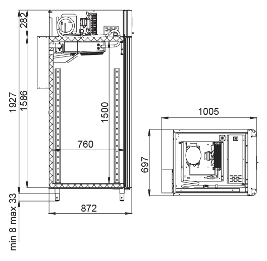 Каталог оборудования Холодильное оборудованиеШкафы холодильныеСпециализированные холодильные шкафыШкаф холодильный для вызревания сыра Polair CS107 Cheese черный, со стеклом Шкаф холодильный для вызревания сыра Polair CS107 Cheese черный, со стеклом Код товара: 062-626 Поделиться: WhatsAppTelegram СравнитьДобавить в КПВ избранное 0 389 300 ₽ В корзину 0 шт Под заказСамовывоз сегодня бесплатно Взять в кредит Купить в лизинг Получить консультацию в WhatsApp Описание Характеристики Отзывы 0 Инструкции 5 Шкаф холодильный для вызревания сыра Polair CS107 Cheese черный, со стеклом предназначен для создания оптимальных условий хранения и дозревания твердых и полутвердых сыров на предприятиях общественного питания и торговли. Монолитный цельнозаливной корпус снаружи изготовлен из стали с полимерным покрытием, внутри — из нержавеющей стали, дверь выполнена из стеклопакета. Оборудование рассчитано на работу при температуре окружающей среды до 40 °С. Особенности: Верхнее расположение агрегата для эффективного охлаждения Многофункциональная русифицированная панель управления с дисплеем диагональю 5" Возможность создания и сохранения собственных программ в памяти электронного блока Четыре перфорированные полки из нержавеющей стали для удобного размещения сыров Встроенный ультразвуковой увлажнитель (требуется подключение к системе очищенной воды и централизованной канализации) Распашная дверь с заливной теплоизоляцией и заменяемым уплотнителем с магнитной вставкой Встроенная ручка для удобства эксплуатации Отключаемая внутренняя LED-подсветка Штампованное углубление в дне корпуса для облегчения ухода Педаль для бесконтактного открывания двери Регулировка уровня влажности от 60% до 95% Максимальная нагрузка на полку — 40 кг Толщина стенок корпуса — 43 мм Polair CS107 Cheese черный, со стеклом — это высокотехнологичное оборудование, которое создает идеальные условия для дозревания и хранения твердых и полутвердых сыров. Надежная конструкция, продвинутые системы увлажнения и управления обеспечивают сохранение качества и вкуса сырной продукции, повышая эффективность работы предприятий общественного питания и торговли.Изображение товара, представленного на фото, может отличаться от его фактического вида. Показать все Габаритные размеры697×1005×1960 ммДиапазон рабочей температурыот -2 до +30 °CДлина697 ммШирина1005 ммВысота1960 ммОбъём700 лКол-во дверей1 Тип двериСтеклянная Количество полок4 штДопустимая нагрузка на полку40 кгУровень влажностиот 60 до 95 %Холодильный агрегатВстроенный Тип оттайкиАвтоматическая Тип охлажденияДинамическое ПодсветкаЕсть ХладагентR290 Вес нетто160 кгВес брутто190 кгБрендPolairВсе специализированные холодильные шкафы Из нержавейкиВсе специализированные холодильные шкафы Стеклянная дверь Оставить отзыв Еще никто не оставил отзыв на этот товар Схема POLAIR CS107 Cheese.jpgИнструкция на POLAIR CS107 Cheese.pdfБрошюра на POLAIR CS107 Cheese.pdfДекларация о соответствии.pdfСертификат соответствия.pdf Похожие товары Перейти в каталог Под заказ 207 942 ₽ Шкаф холодильный HURAKAN HKN-MA350 для созревания мяса В наличии 403 670 ₽ Шкаф холодильный для хлебопекарных производств Polair CS107 Bakery Br (Тип 2) Под заказ 414 545 ₽ Шкаф холодильный для хлебопекарных производств Polair CS107-Bakery Br со стеклом (Тип 1) Под заказ 391 000 ₽ Шкаф холодильный для вызревания мяса Polair CS107 Meat (Тип 2) Под заказ 391 000 ₽ Шкаф холодильный для вызр