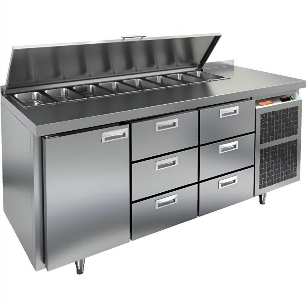 Каталог оборудования Холодильное оборудованиеСтолы охлаждаемыеСтолы холодильные для салатовСтол холодильный для салатов HiCold SL1-133GN (1/3) с крышкой Стол холодильный для салатов HiCold SL1-133GN (1/3) с крышкой Код товара: 064-848 Поделиться: WhatsAppTelegram СравнитьДобавить в КПВ избранное 0 209 962 ₽ В корзину 0 шт Под заказСамовывоз сегодня бесплатно Взять в кредит Купить в лизинг Получить консультацию в WhatsApp Описание Характеристики Отзывы 0 Стол холодильный для салатов HiCold SL1-133GN (1/3) предназначен для использования на предприятиях общественного питания и торговли. Он объединяет рабочую поверхность и охлаждаемый отсек, что делает его удобным решением для хранения, охлаждения и подготовки ингредиентов при приготовлении салатов, пиццы и других блюд. Такая конструкция позволяет повару работать быстрее и эффективнее, так как все необходимые продукты находятся под рукой. Корпус и столешница выполнены из прочной нержавеющей стали, устойчивой к коррозии и легко поддающейся санитарной обработке. Металлическая крышка защищает продукты от загрязнений и сохраняет их свежесть. Особенности модели: Электронная панель управления — точная настройка температурного режима. 1 глухая дверь — удобный доступ к холодильному отсеку. 6 выдвижных ящика — быстрое размещение и замена продуктов. Вместимость салат-бара — до 8 гастроемкостей глубиной до 100 мм. Автоматические доводчики дверей с фиксацией в открытом положении. Легкозаменяемые магнитные уплотнители — надежная герметичность. Открытая агрегатная часть — быстрый доступ для обслуживания. Регулируемые по высоте ножки — устойчивость даже на неровном полу. Толщина столешницы, борта и теплоизоляции — 50 мм, что обеспечивает прочность и энергоэффективность конструкции. HiCold SL1-133GN (1/3) — практичное и удобное решение для профессиональной кухни, обеспечивающее удобную подготовку и хранение ингредиентов. Изображение товара, представленного на фото, может отличаться от его фактического вида. Показать все Габаритные размеры1835×700×850 ммДиапазон рабочей температурыот +2 до +10 °CРасположение агрегатаБоковое Материал столешницыНержавеющая Тип столаС дверьми и ящиками Тип двериГлухая Объём505 лКоличество дверей1 штТип гастроемкостейGN 1/3 Количество ящиков6 штРазмер полки530×325 ммНапряжение220 ВМощность0,46 кВтТип охлажденияДинамическое Тип оттайкиАвтоматическая СтолешницаС бортом Габариты в упаковке2000×850×1000 ммВес нетто130 кгВес брутто185 кгБрендHicold Оставить отзыв Еще никто не оставил отзыв на этот товар Ранее просмотрено Под заказ 140 482 ₽ Стол холодильный для салатов HiCold SL2-11GN (1/6) О без крышки Под заказ 255 412 ₽ Стол холодильный для салатов HiCold SL1-222GN (1/3) без крышки