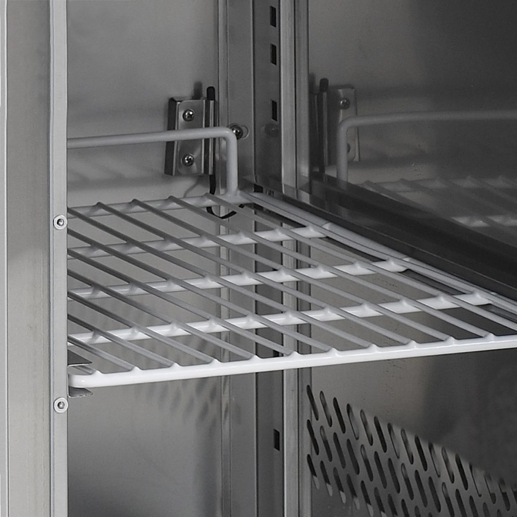 Стол оснащен компрессором, градусником, 2 выдвижными ящиками GN 1/1, полкой GN 1/1 и регулируемыми ножками, что делает рабочее пространство эргономичным и удобным для поваров.