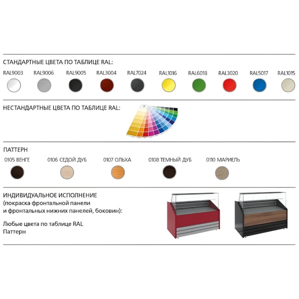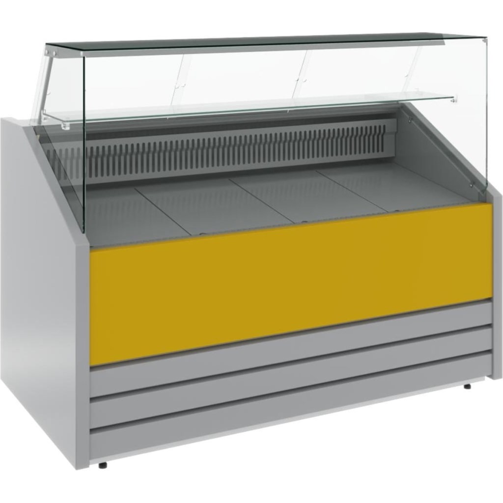 Конструкция витрины включает накопитель для продуктов, поддон для выкладки и регулируемые ножки высотой 20–35 мм. Столешница, зона выкладки, боковые и нижняя фронтальная панели, а также обшивка светильника и испарителя выполнены из стали серебристого цвета. Декоративная передняя панель — из стали, держатель стекла — из нержавеющей стали. Боковины и столешница имеют пенополиуретановую теплоизоляцию.