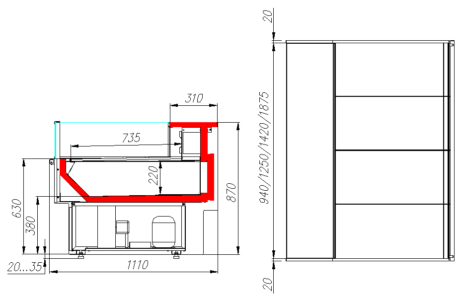 • Длина без боковин — 1875 мм, что обеспечивает совместимость с линейными системами торгового оборудования.