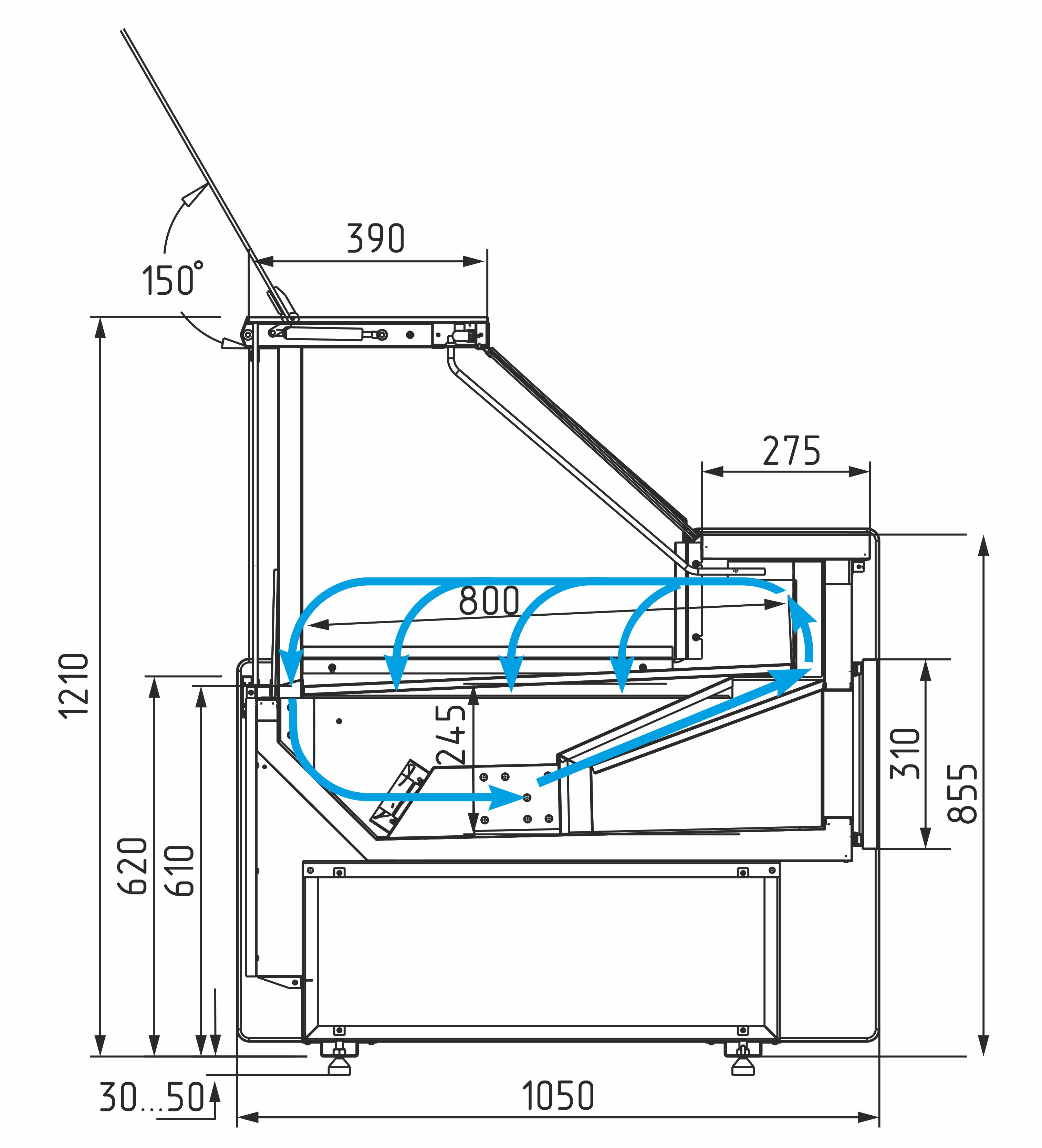 • Подъёмное фронтальное стекло с газлифтом — удобный доступ к продуктам и лёгкое обслуживание.